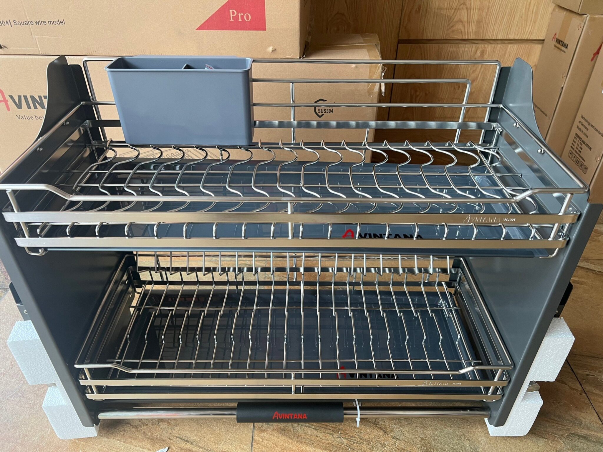 Giá bát đĩa nâng hạ inox 304 Avintana, phiên bản có ống đựng đũa – AN-370VE